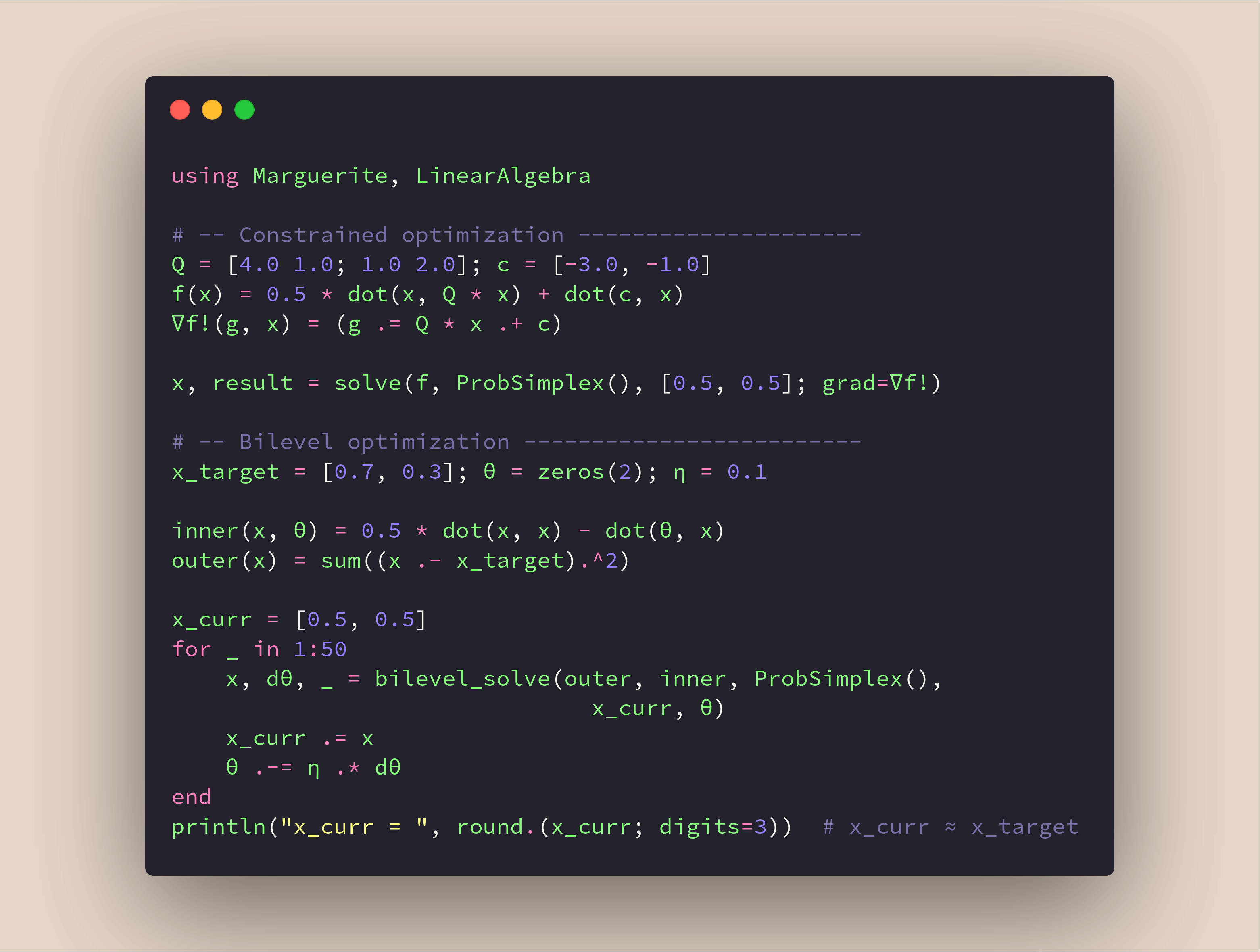 Pkg.add(url="https://github.com/samtalki/Marguerite.jl")